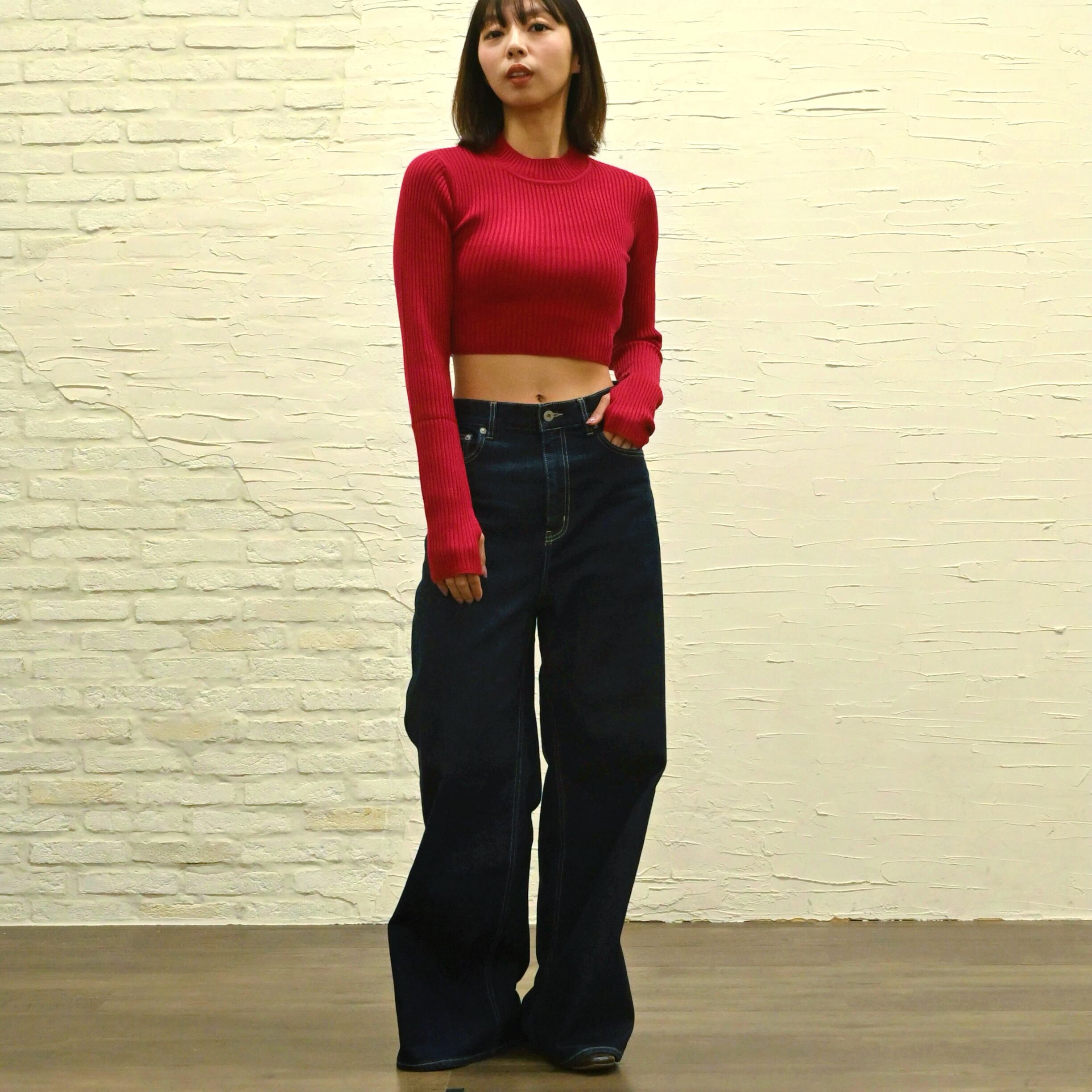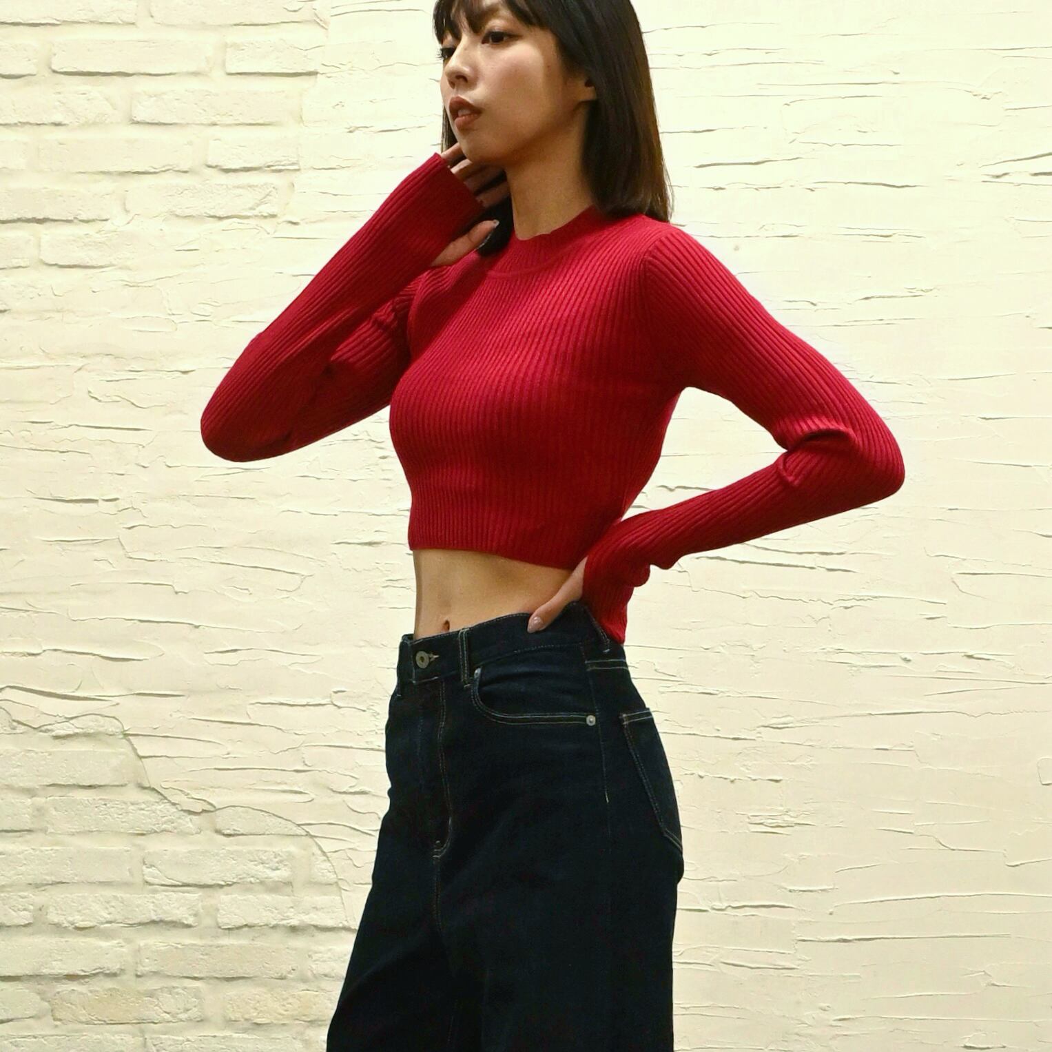 スッキリとしたクルーネックでネックレスやチョーカーなどのアクセサリーも映える。