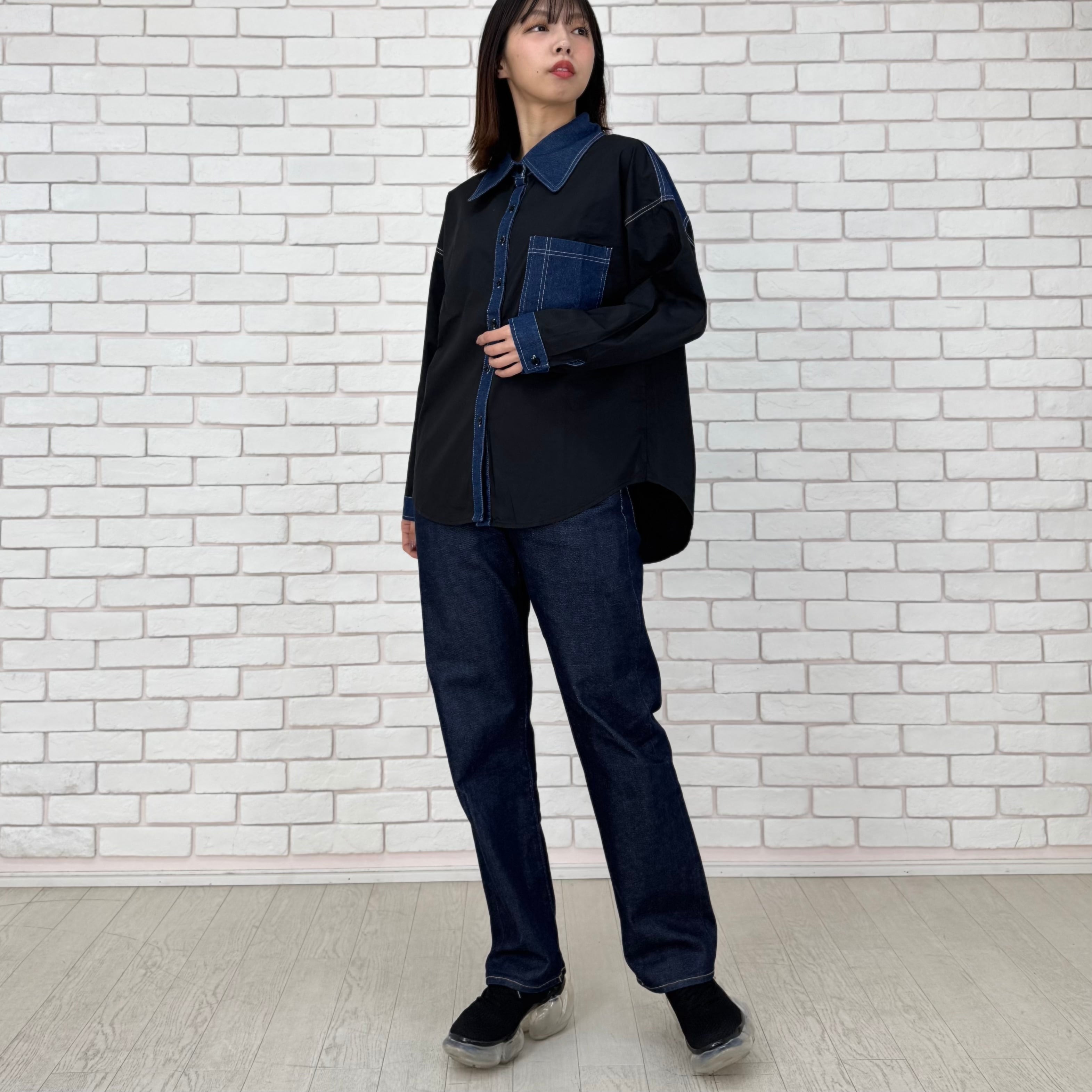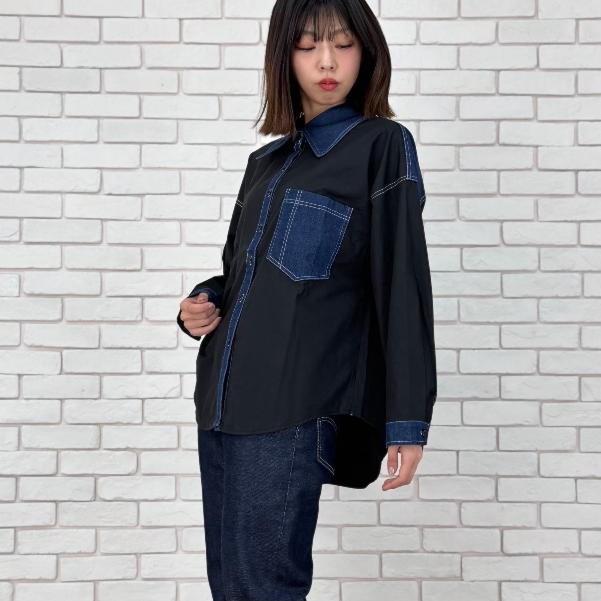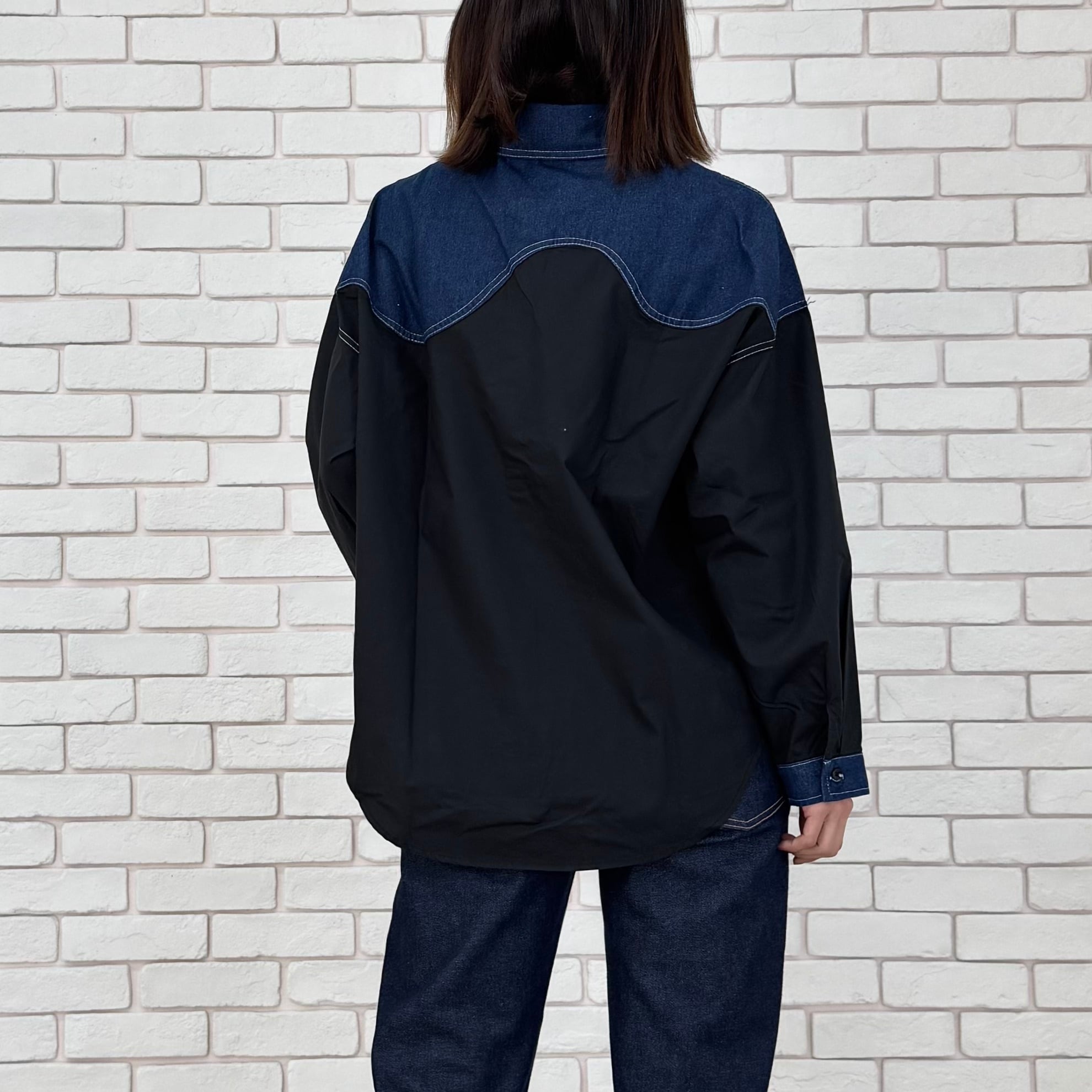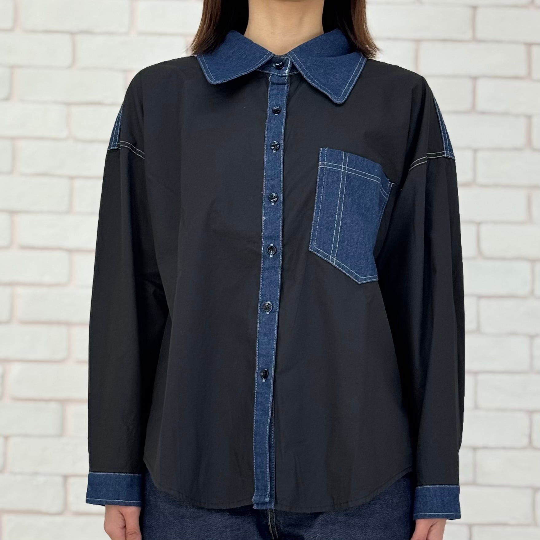 黒の布帛素材とデニムの切替ブラウス