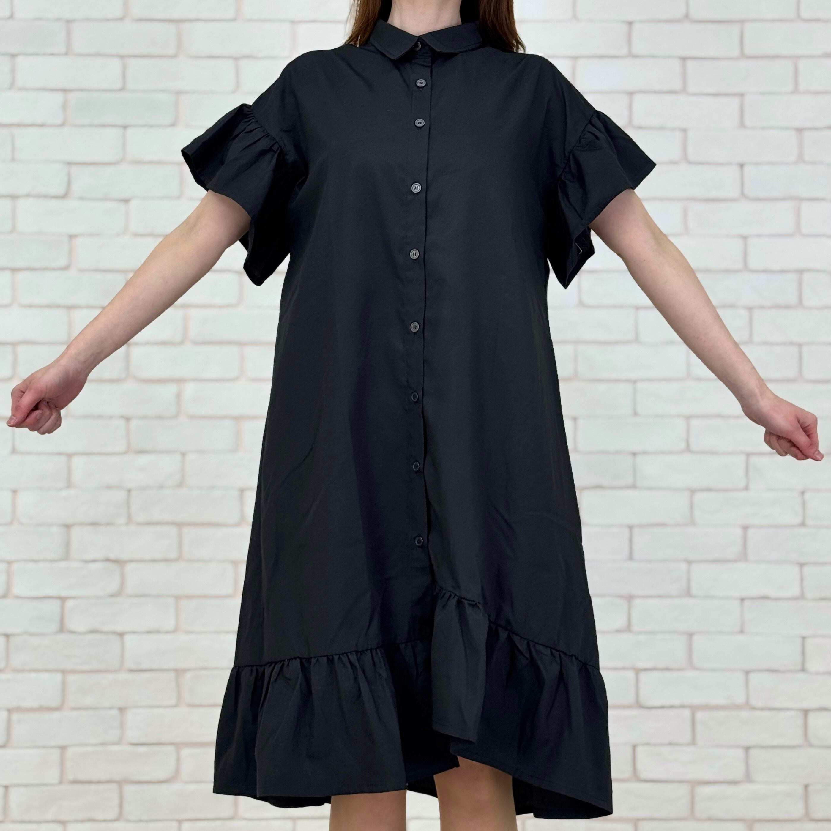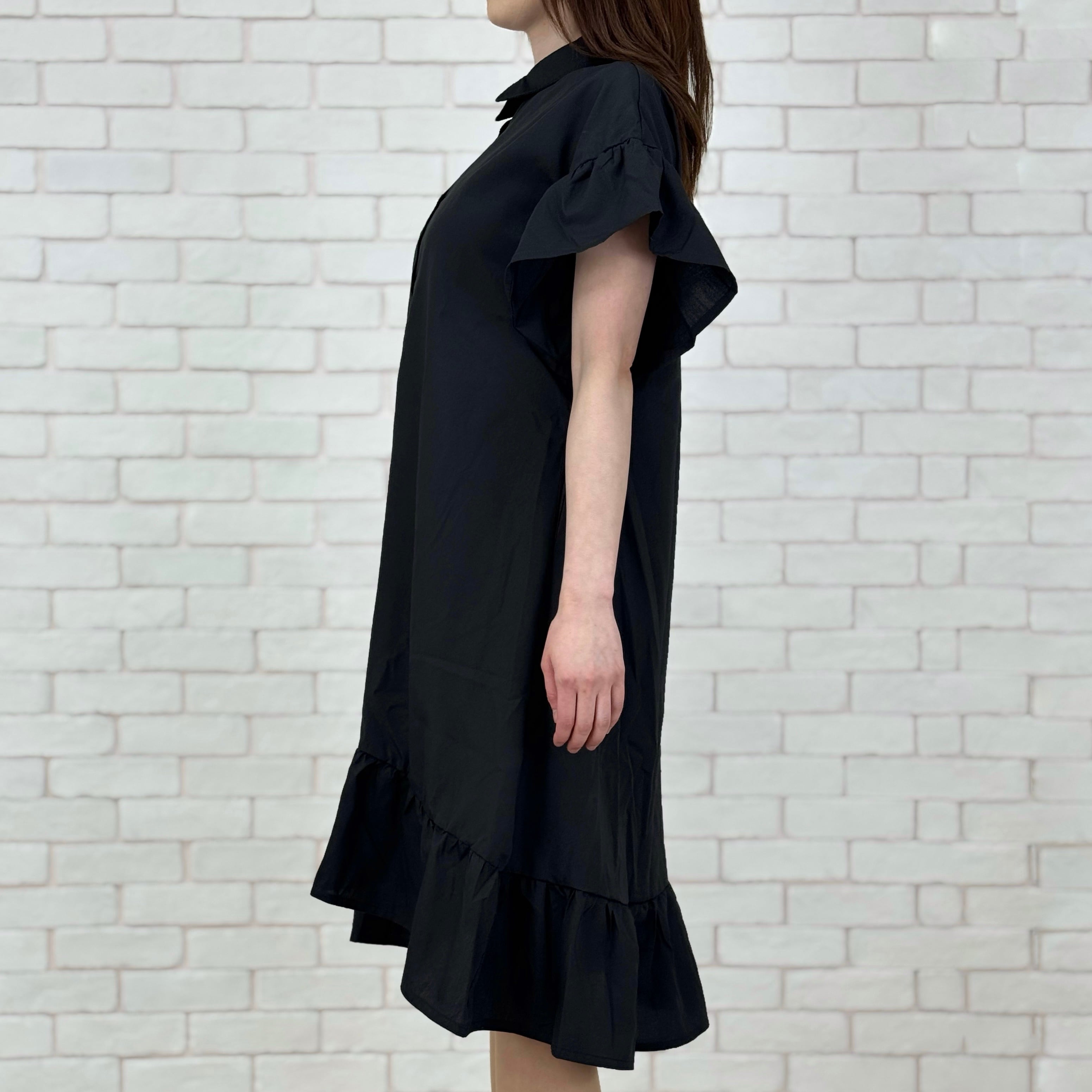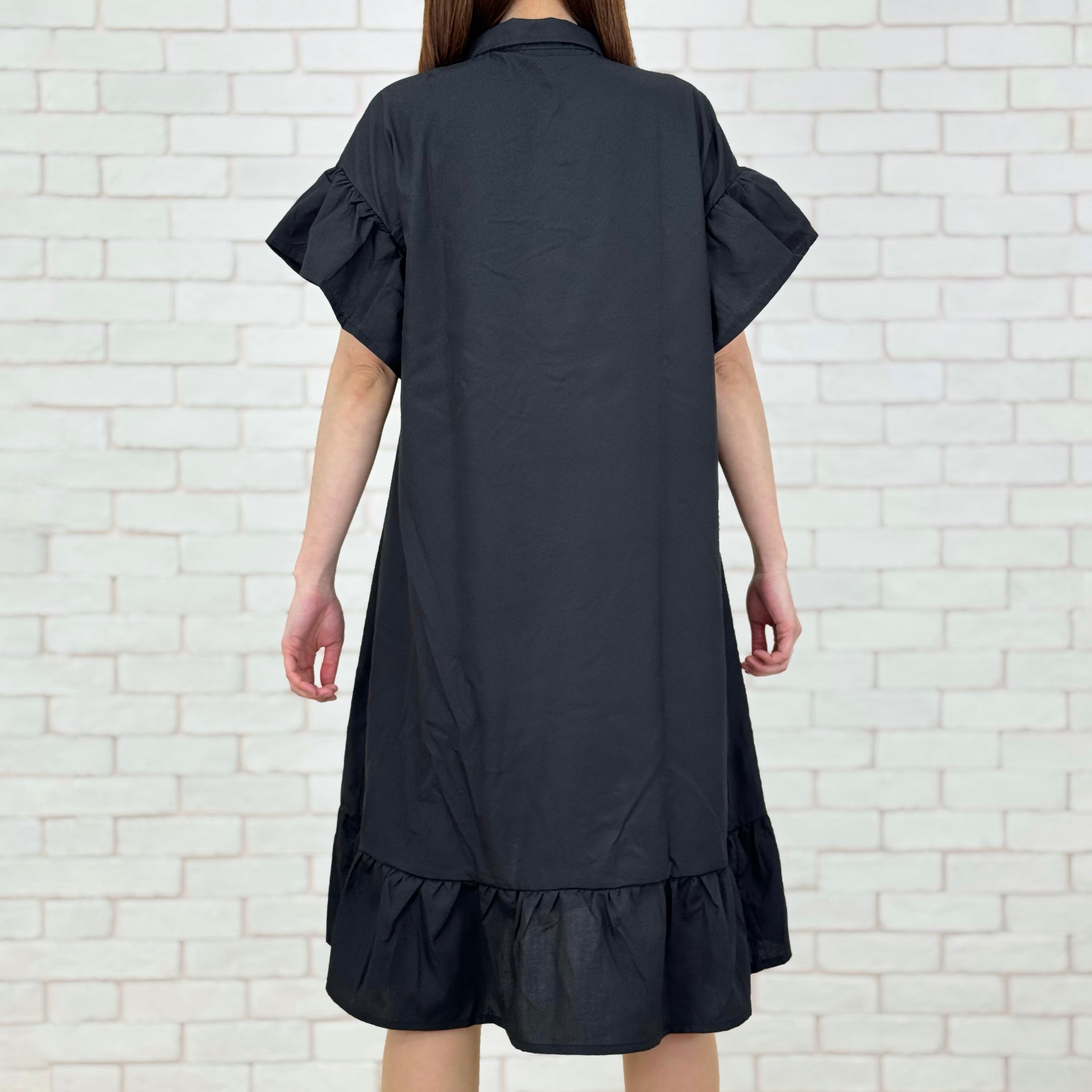 袖と裾がフリルになった前開きワンピース。