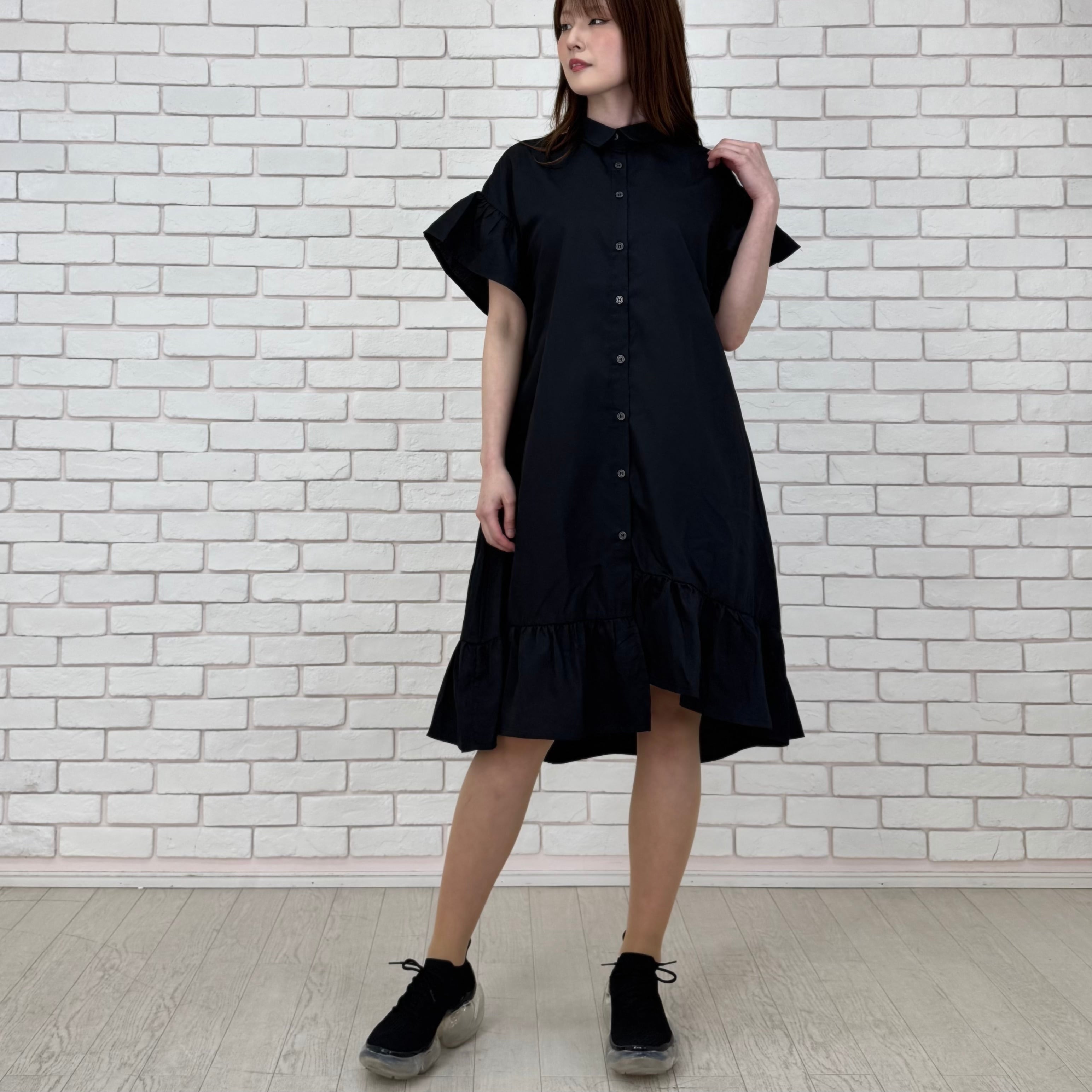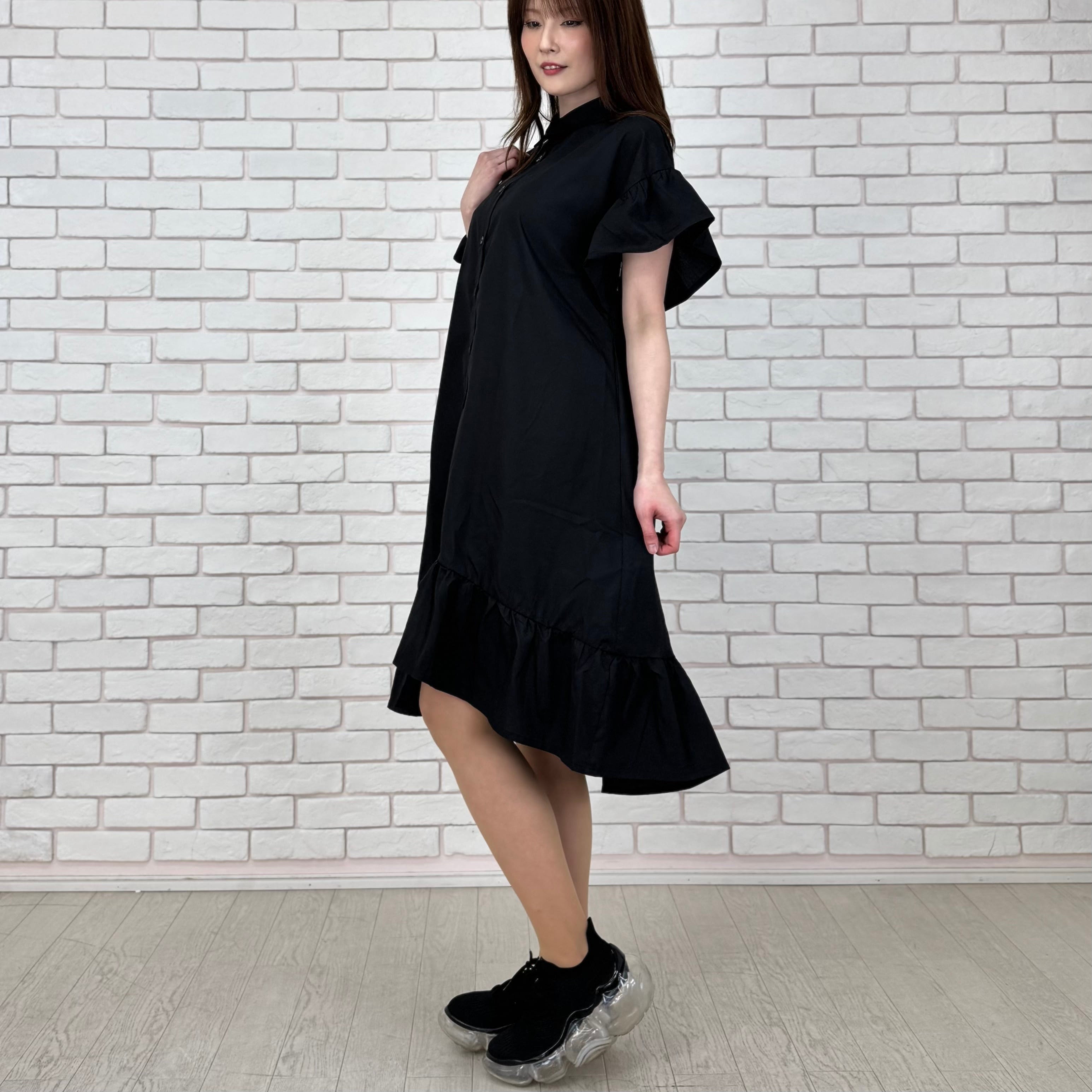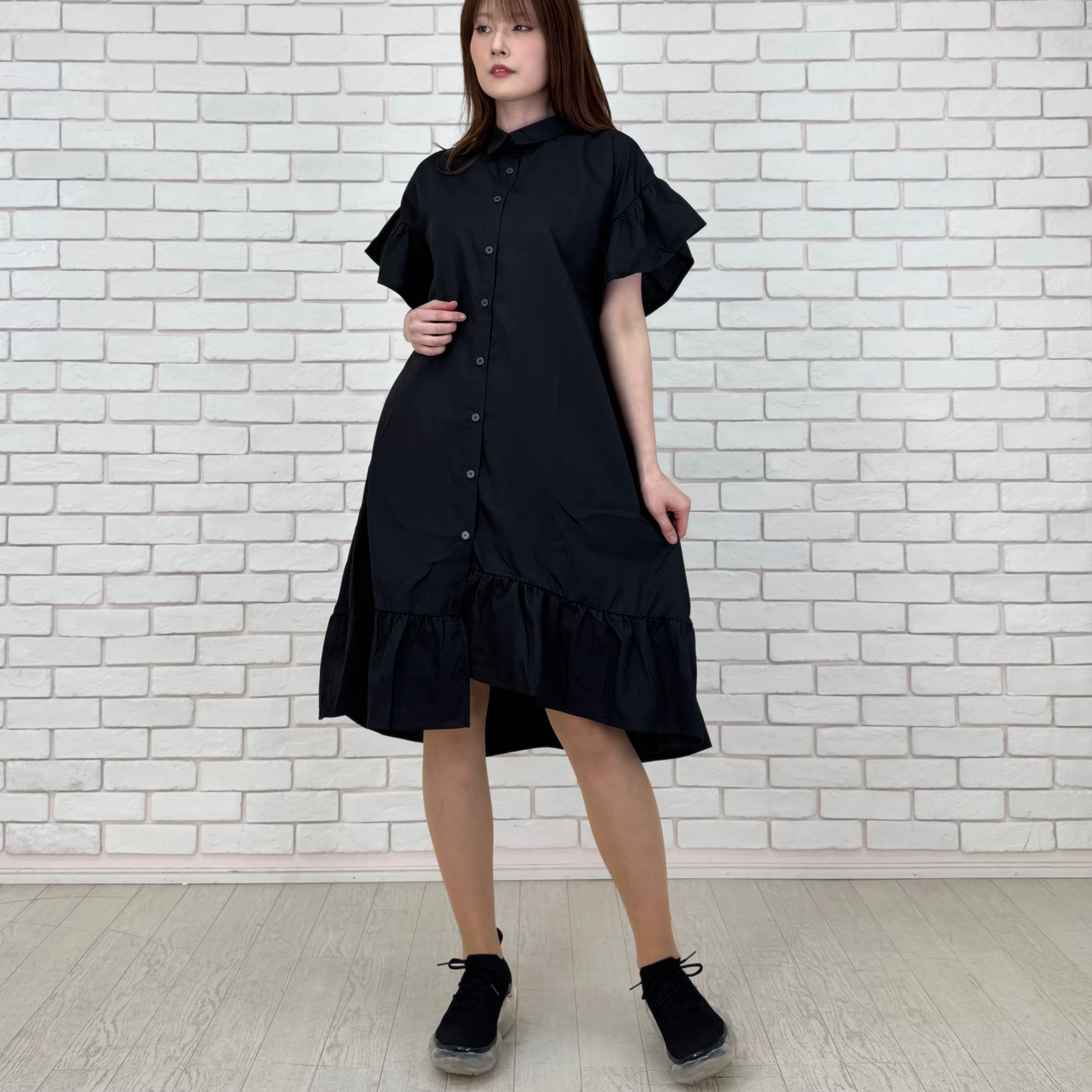 袖と裾がフリルになった前開きワンピース。