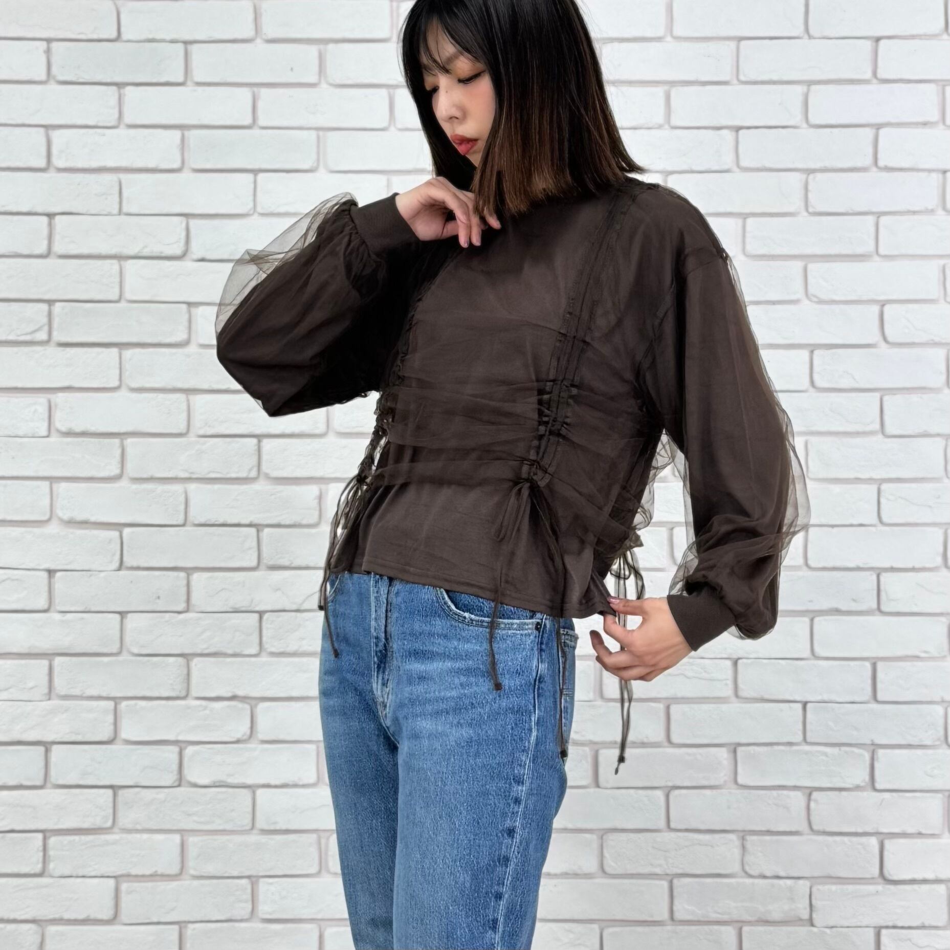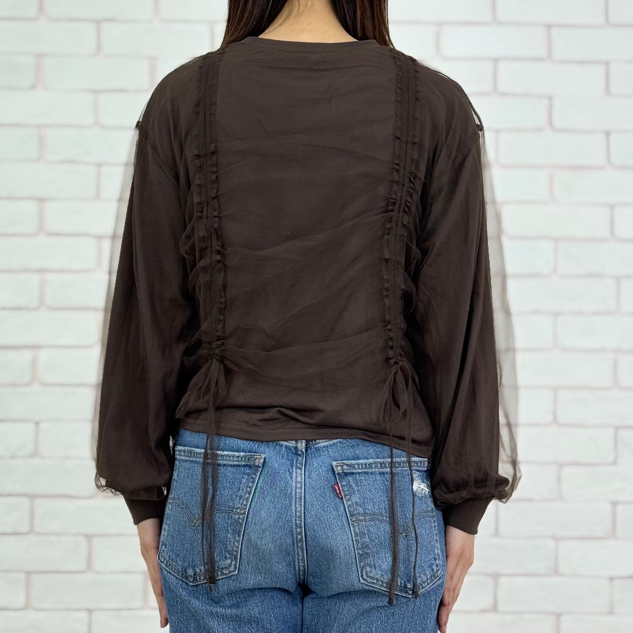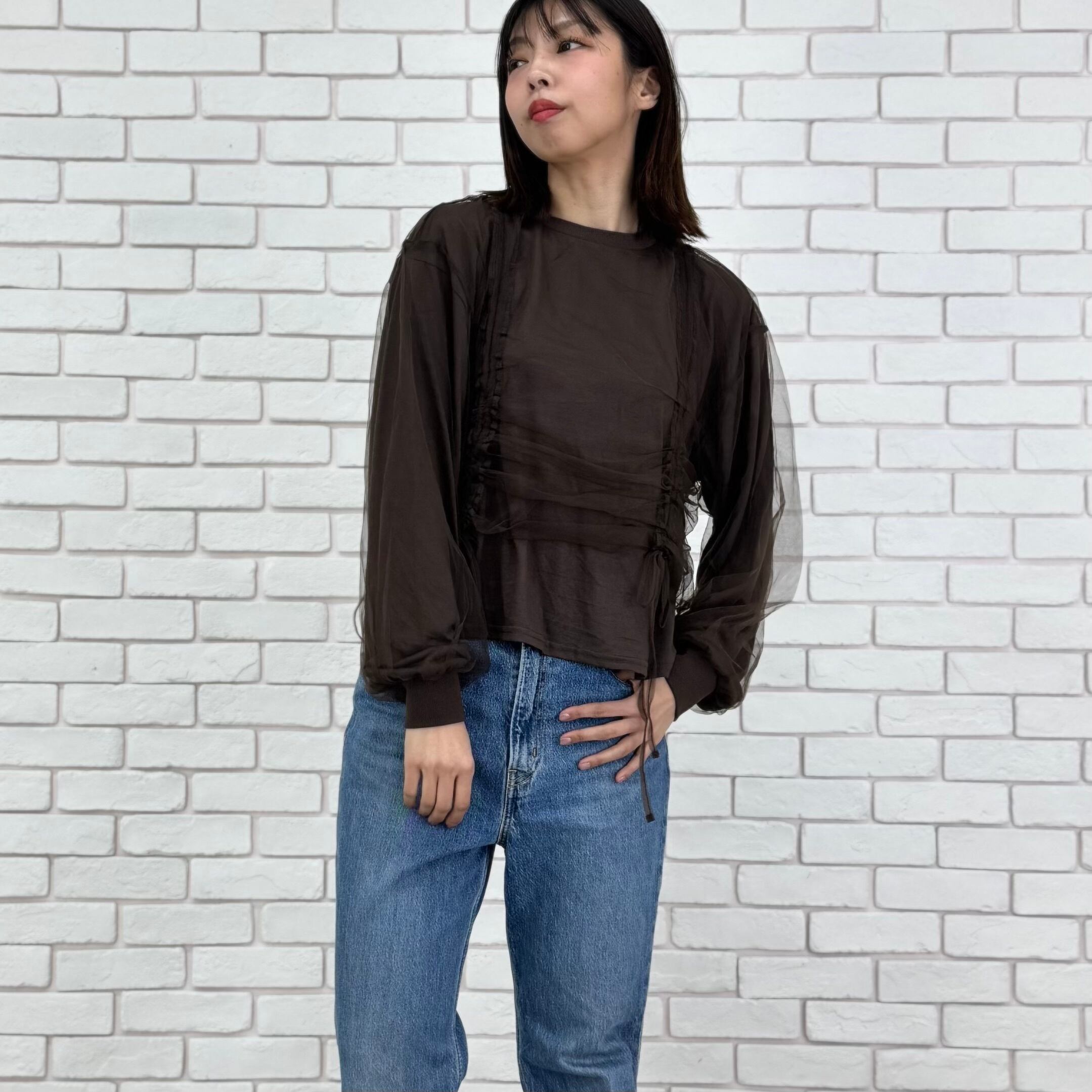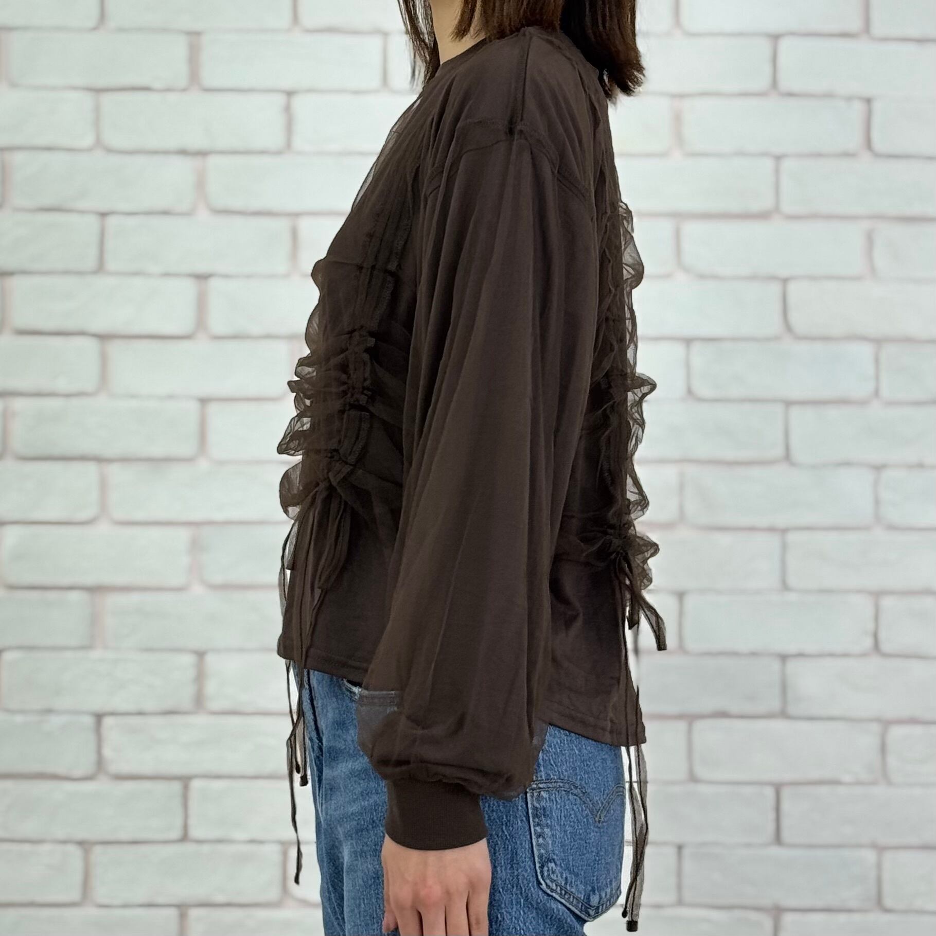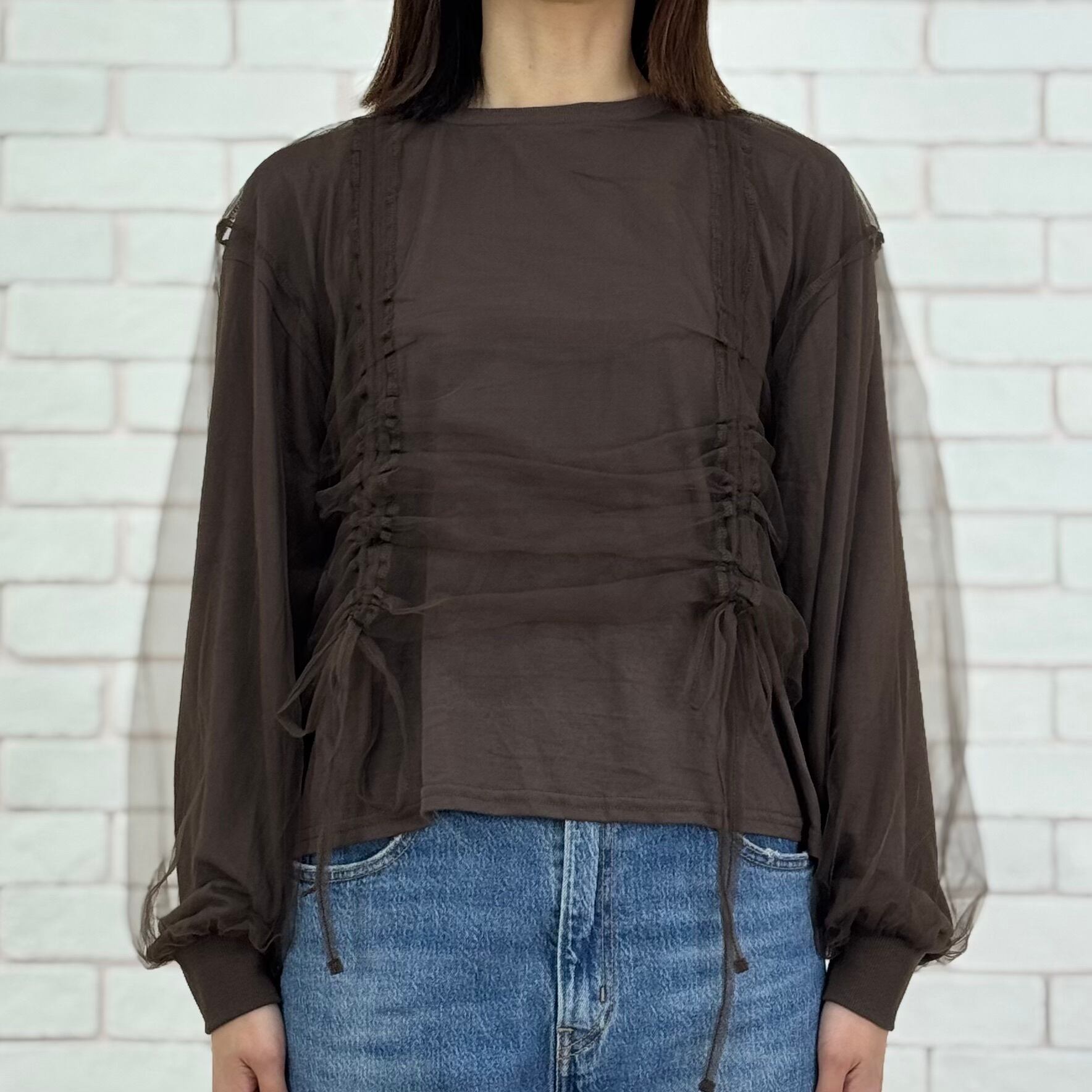 女性らしいギャザーを施したチュールドッキングした1枚で着映え抜群のトップスです。