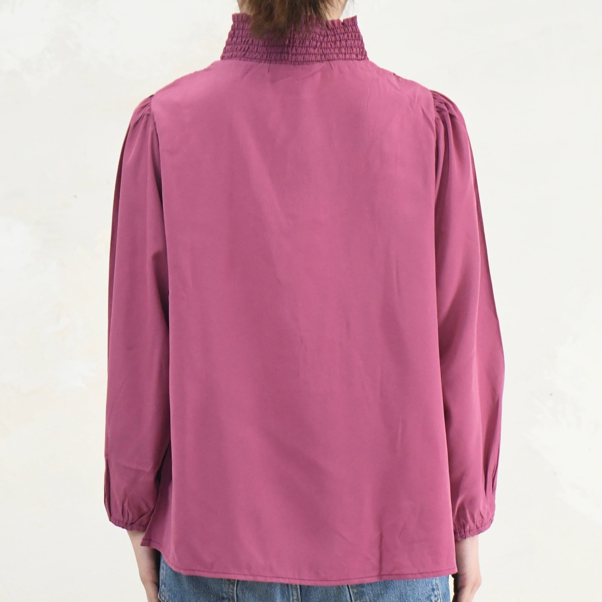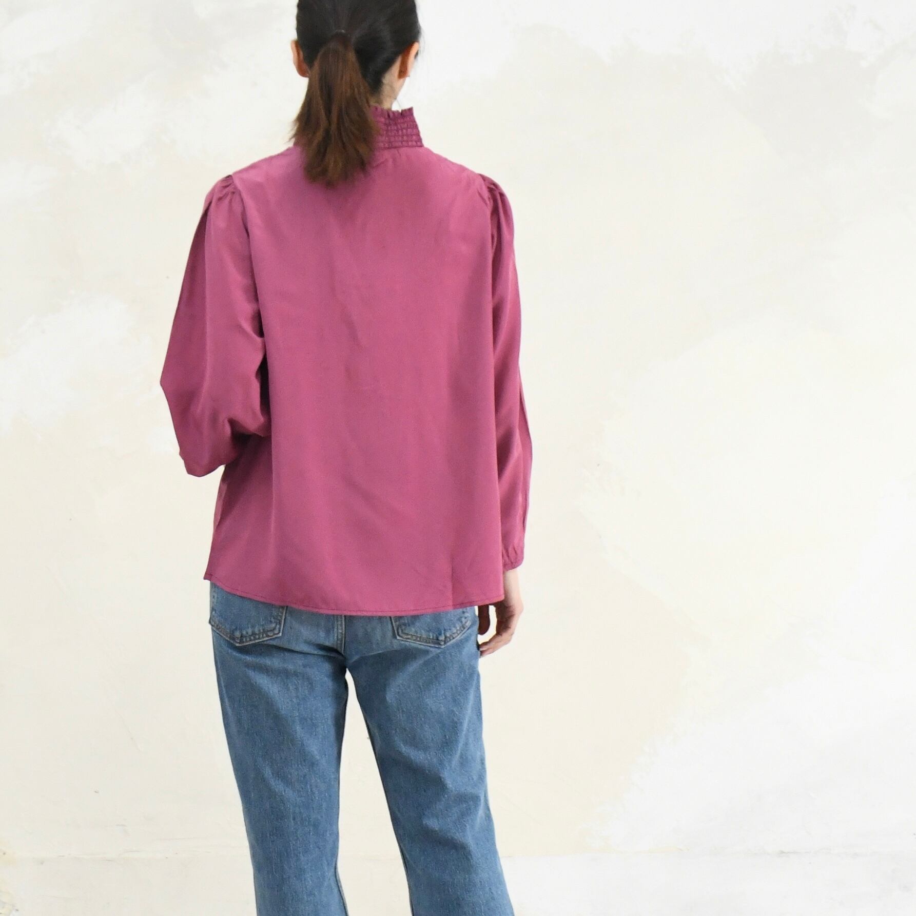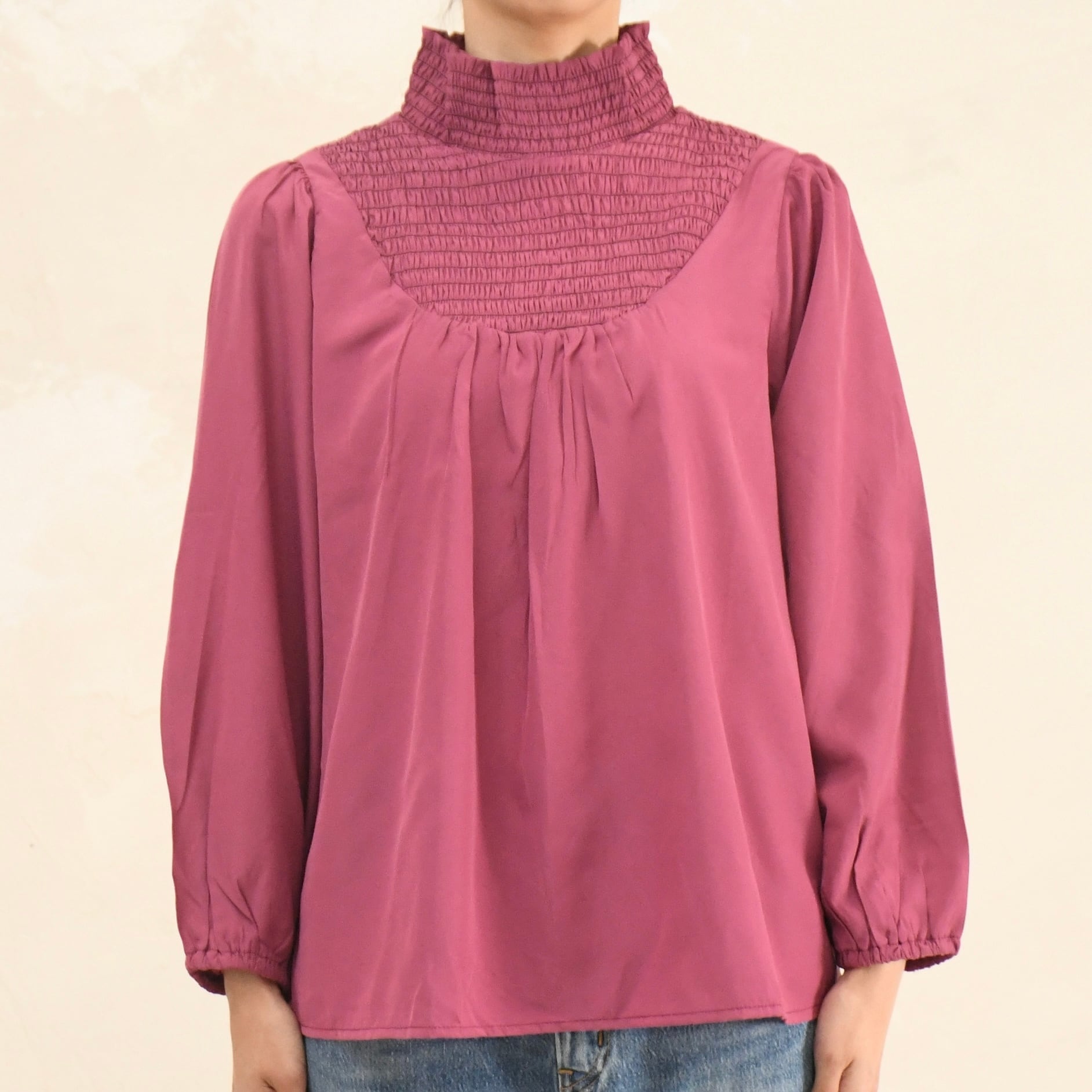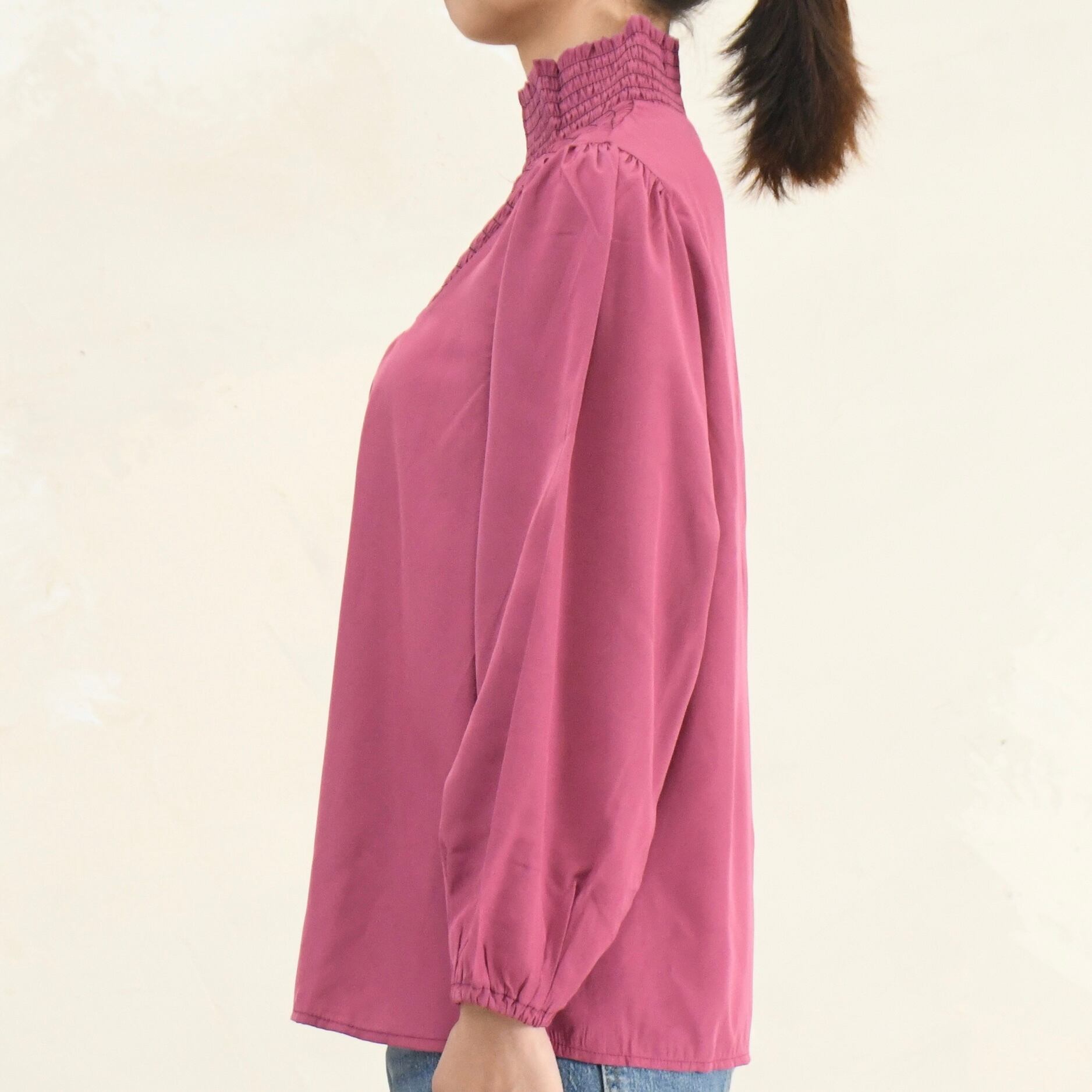 ネック+胸の上部分のみに細かいシャーリング(伸縮性あり)を入れ、