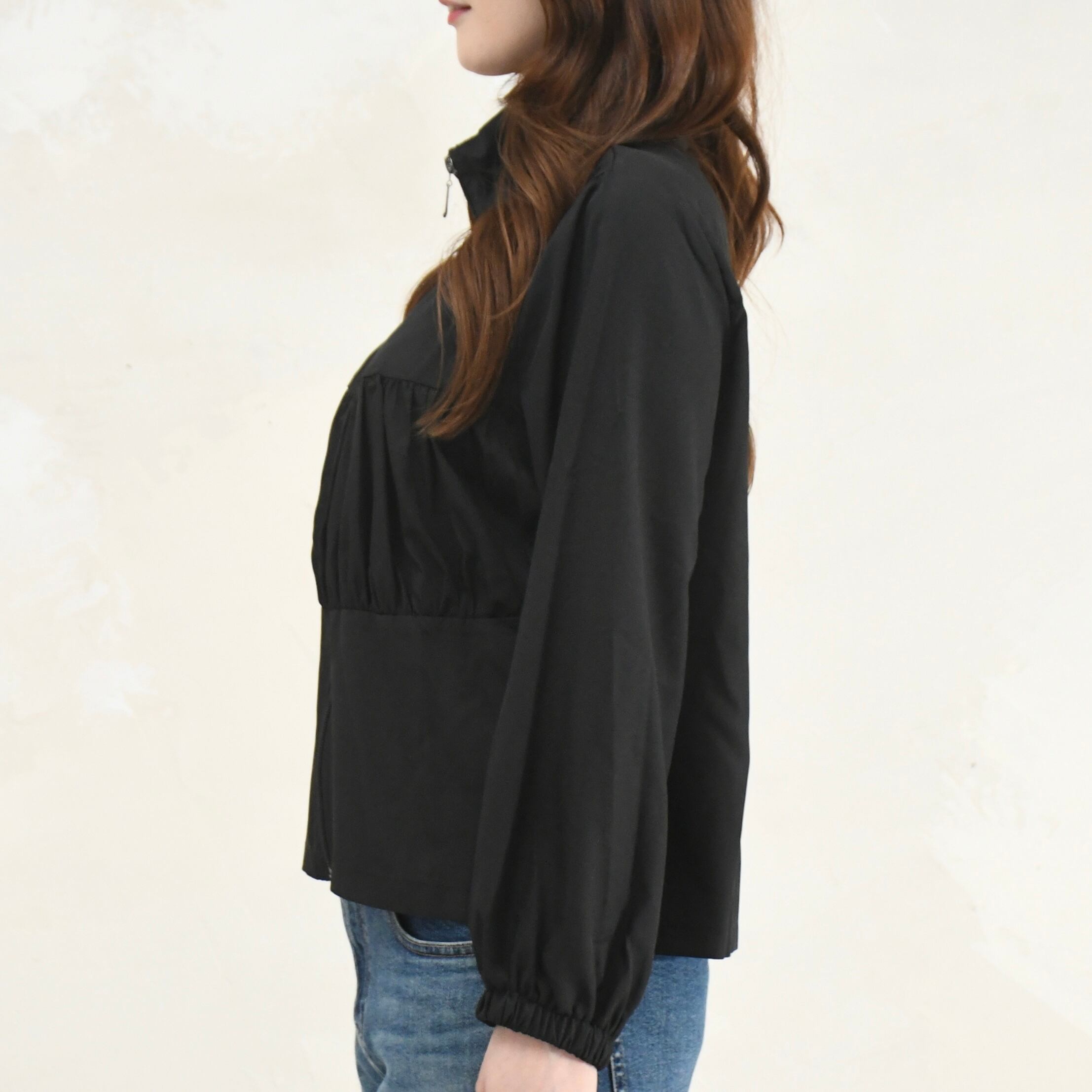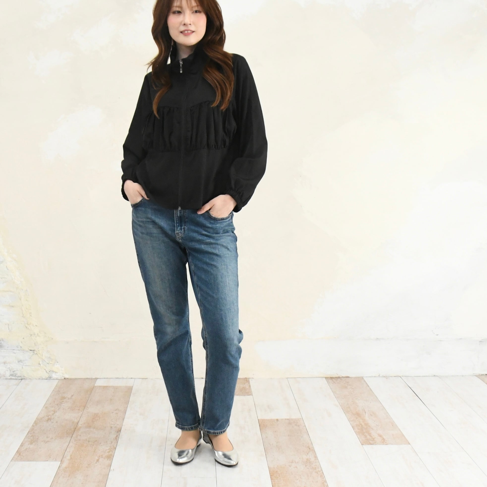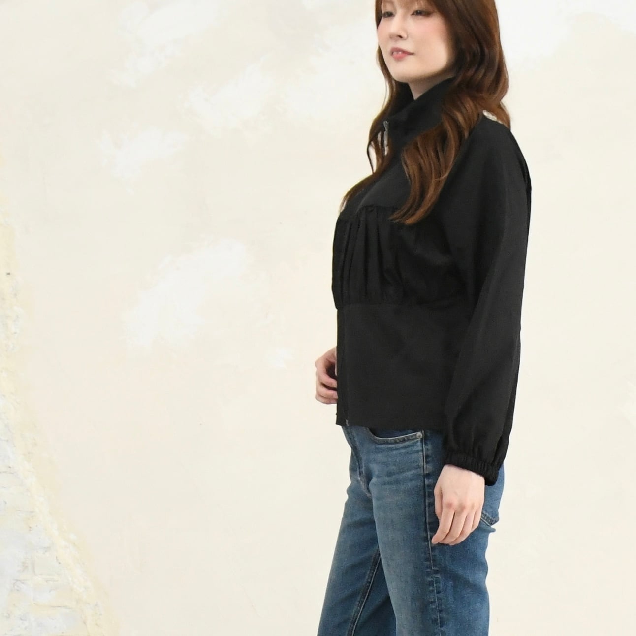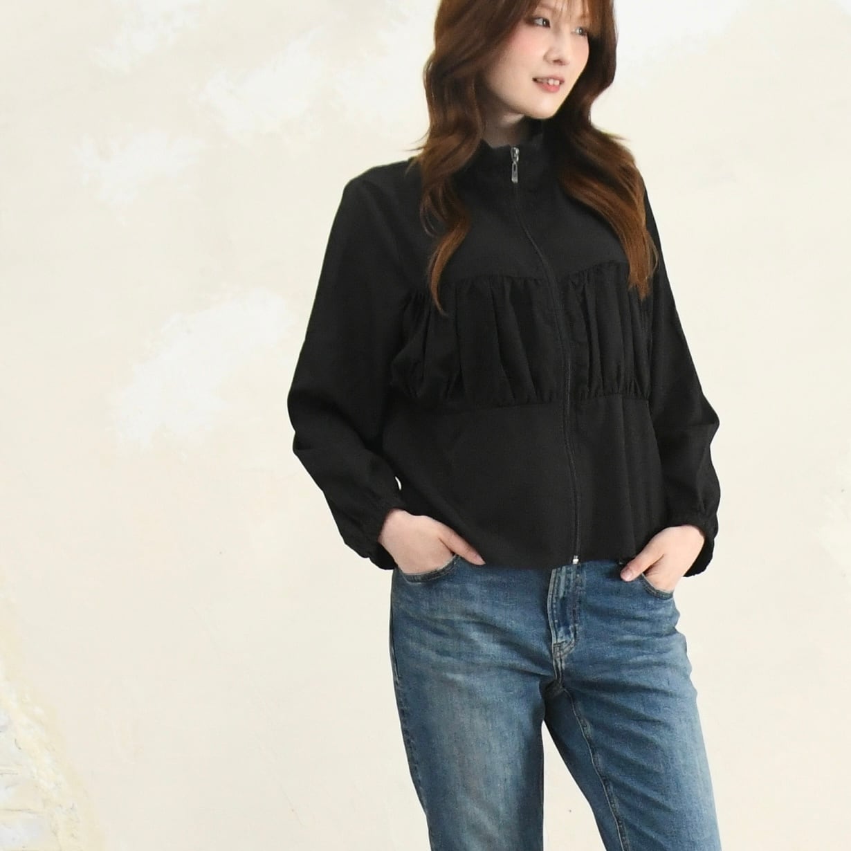 前身頃の真ん中にたっぷりギャザーが入った切り替えデザインの軽やかなブルゾンです♪