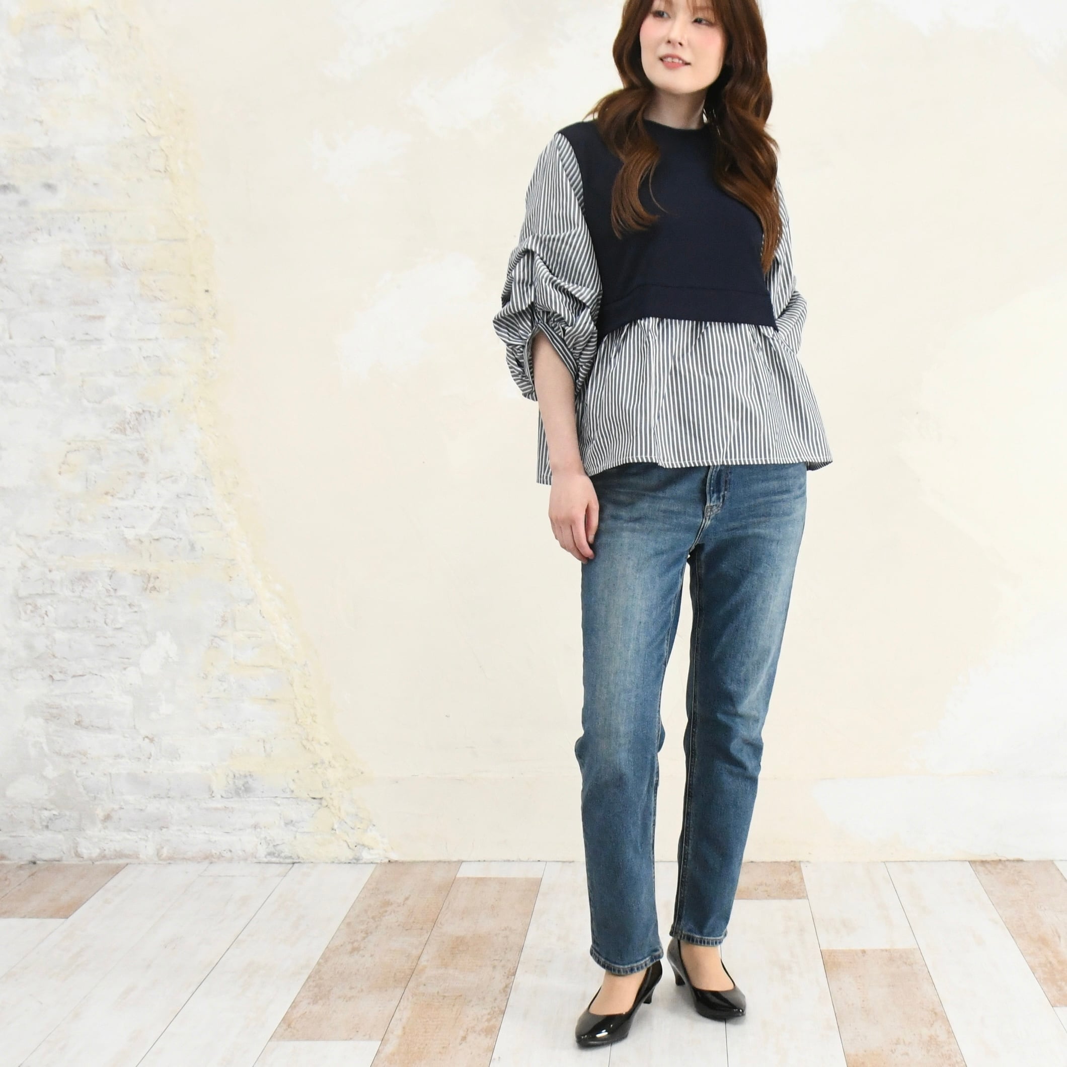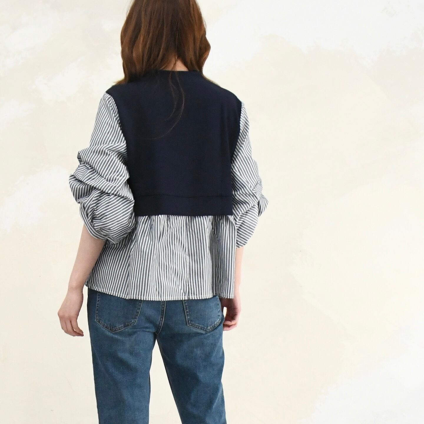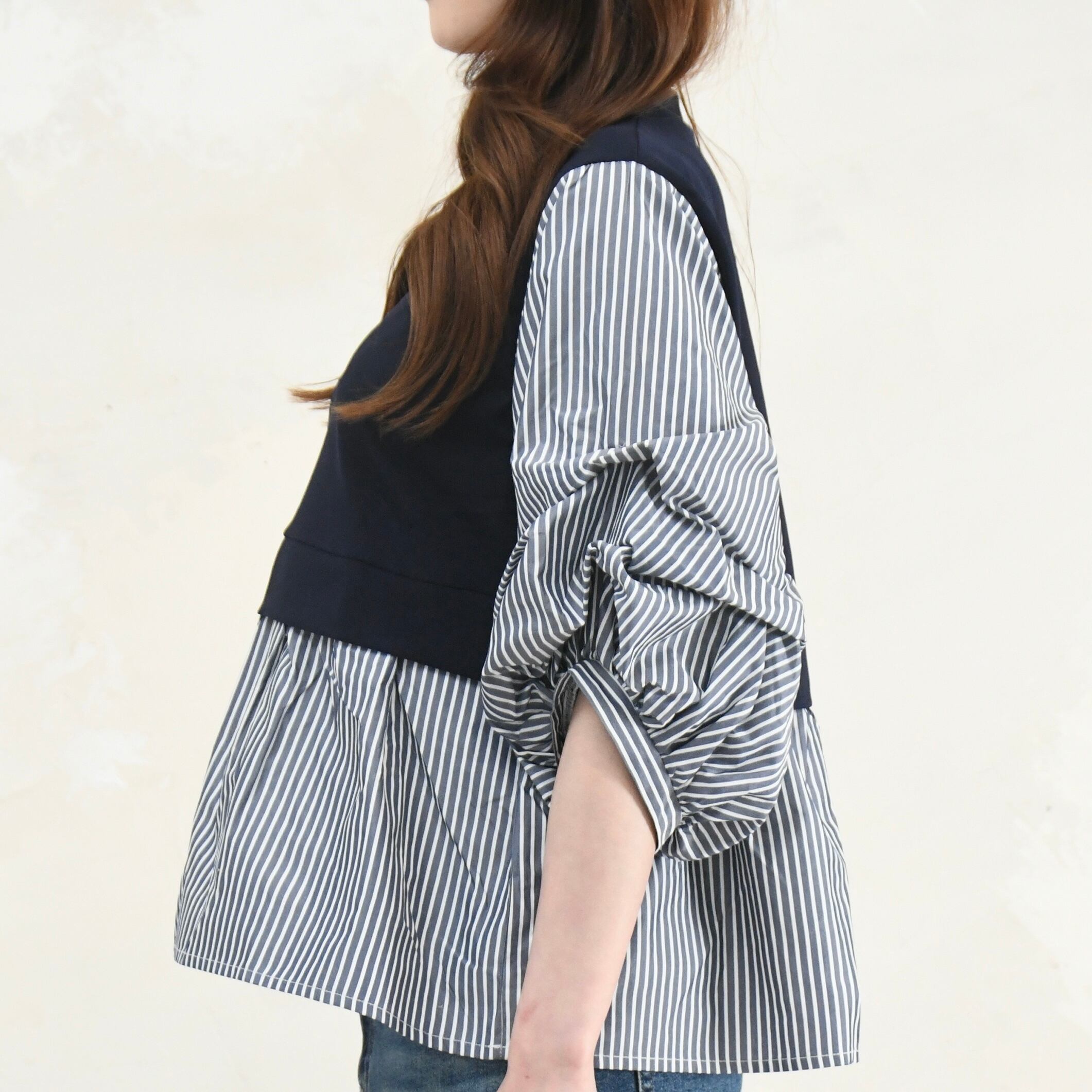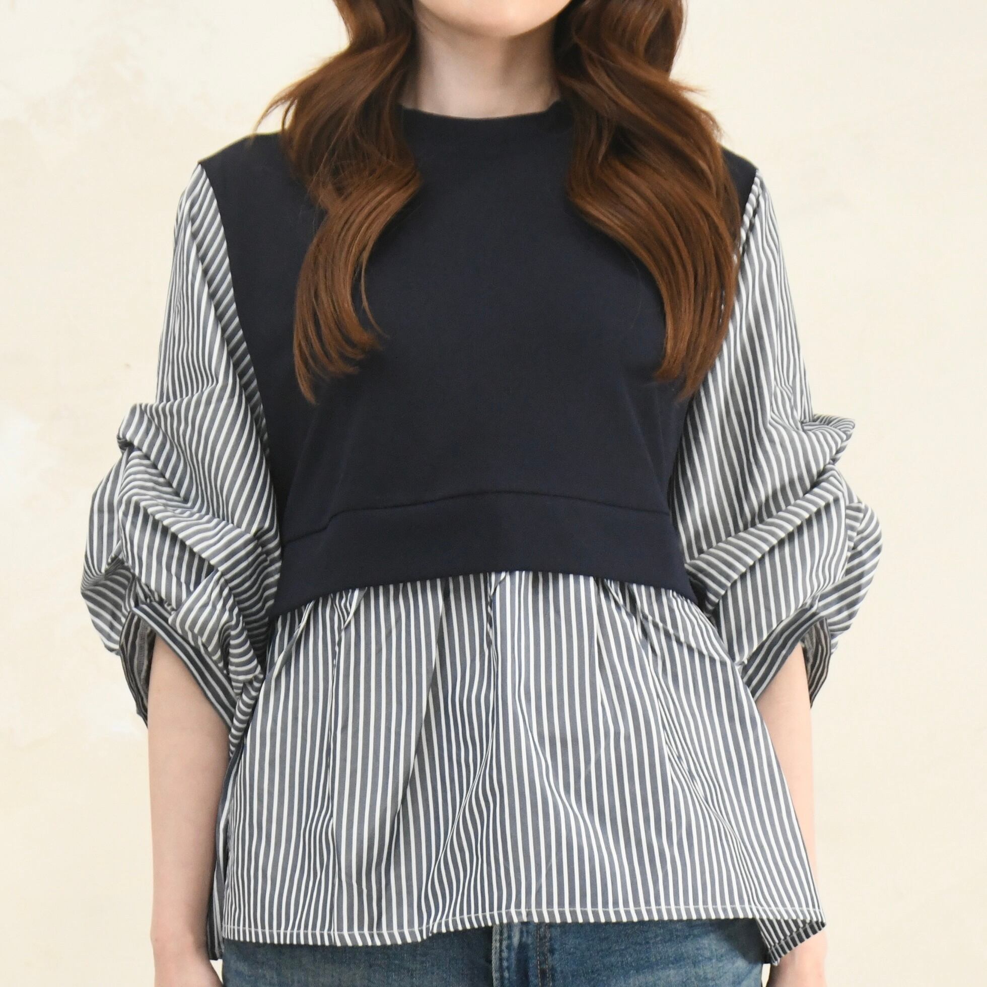 重ね着しているようなデザインの無地×ストライプの異素材チュニックブラウスです。